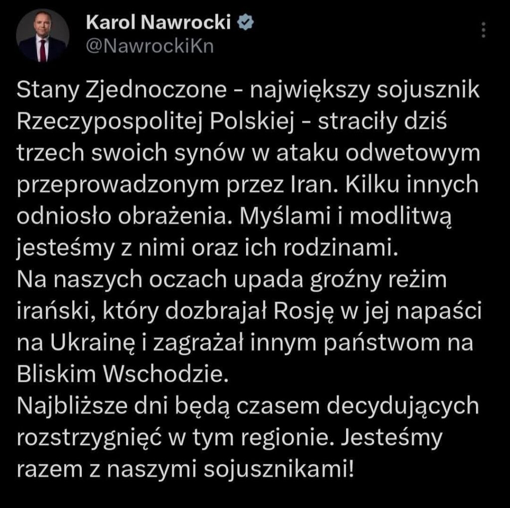 W końcu wylądowaliśmy w Polsce i jej reakcjach. Tu – przynajmniej do dziś – nie skończyło się to tym, że reakcja na wojnę z Iranem sprowadziła się do wzajemnych zarzutów plemiennych, że jedno się stara bardziej od drugiego. Reakcja rządu Tuska, ustami Sikorskiego i Kamysza, powiela schemat pomieszania – z jednej strony ten straszny Trump i by się walnęło, z drugiej – nietykalny Izrael. Kto ma zadatki sadystyczne to może sobie oglądać jak z tym spektaklem się męczy np. TVN. Pojawiły się też wątki solidaryzmu Polski z krajami regionu, co wskazuje na utrwalenie trendu ustawienia Iranu jako agresora. Tematem zastępczym jest suflowana troska o zatrzaśniętych w regionie Polaków, co stoi w sprzeczności z realiami. Nasi tam nie wysyłali żadnych samolotów po swoich, tłumacząc się, że jest tam strzelanina i się nie lata. Potem zrobiono badania opinii publicznej i wyszło, że to jest jednak źle odbierane i jakoś argumenty na NIE w sprawie lotów zniknęły czarodziejsko. Nieżyczliwi pokazywali tu przykład choćby Czechów, którzy autobusami przewożą swoich do krajów o swobodzie ruchu lotniczego. A więc i tu klapa. Tuski grają tu na raczej przemilczanie swego stanowiska wobec wojny, udając strategiczną postawę niezaangażowania, choć jest to raczej wybieg taktyczny i wzorowany na postawie unijnej. Sikorski w swoim expose sprzed kilku dni nawet nie wspomniał o Iranie i naszej postawie wobec nieuchronnej wojny – teraz udaje, że wszystko miał przemyślane.