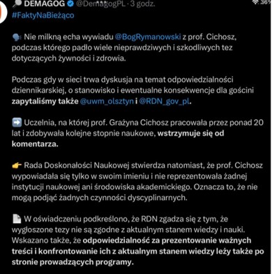 A to, że panie, pani profesor bzdury gada, a to, że to figa z niej nie dietetyk i niech się nie mądrzy, że podważa ustalenia naukowej dietetyki mówiąc o tym, co nam wpychają codziennie do dzioba. Odezwał się nawet (uwaga!) „znany popularyzator wiedzy z TikToka”, który zarzucił pani profesor dezinformację. Wezwano również do wyciągnięcia nie tyle wniosków, ale i konsekwencji wobec pani profesor, co rokuje kolejnym aktem, po procederze tropienia kowidowych odszczepieńców, polowania na czarownice. Z braku laku, czyli dowodów, znowu wysunięto na front nieskazitelne autorytety, które zamiast faktami zaczęły operować skalą swego prestiżu. Mamy więc zamiast Evidence Based Medicine, Authority Based Medicine, co zwalnia wszystkich od używania tych nurzących dowodów. Myślę, że pani profesor sobie poradzi, ale zobaczmy co z panem redaktorem.