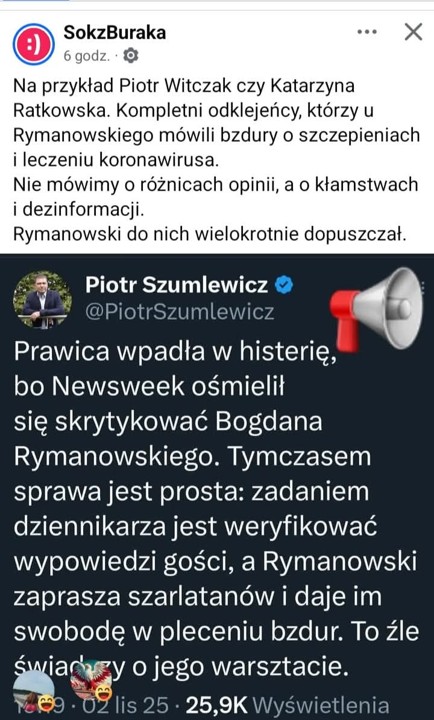 Tyle, że tych wszystkich „obiektywnych” a właściwe „naukawych” weryfikacji nasłuchaliśmy się po kokardę w czasach kowidu. I niestety większość z nich nie wytrzymała właśnie weryfikacji faktów opartych na nauce. Co więc pozostało? Ano – powtarzanie mantr, że przecież „wszyscy wiemy” jak to było/jest i podpieranie się autorytetami. Słabe to wszystko jako model „weryfikacji”. I tak jest i teraz z tą sprawą Rymanowskiego. Podejście redaktora jest proste – wolność słowa jest pełna, albo jej nie ma, co potwierdził w swym wpisie-odpowiedzi na zarzuty Newsweeka.